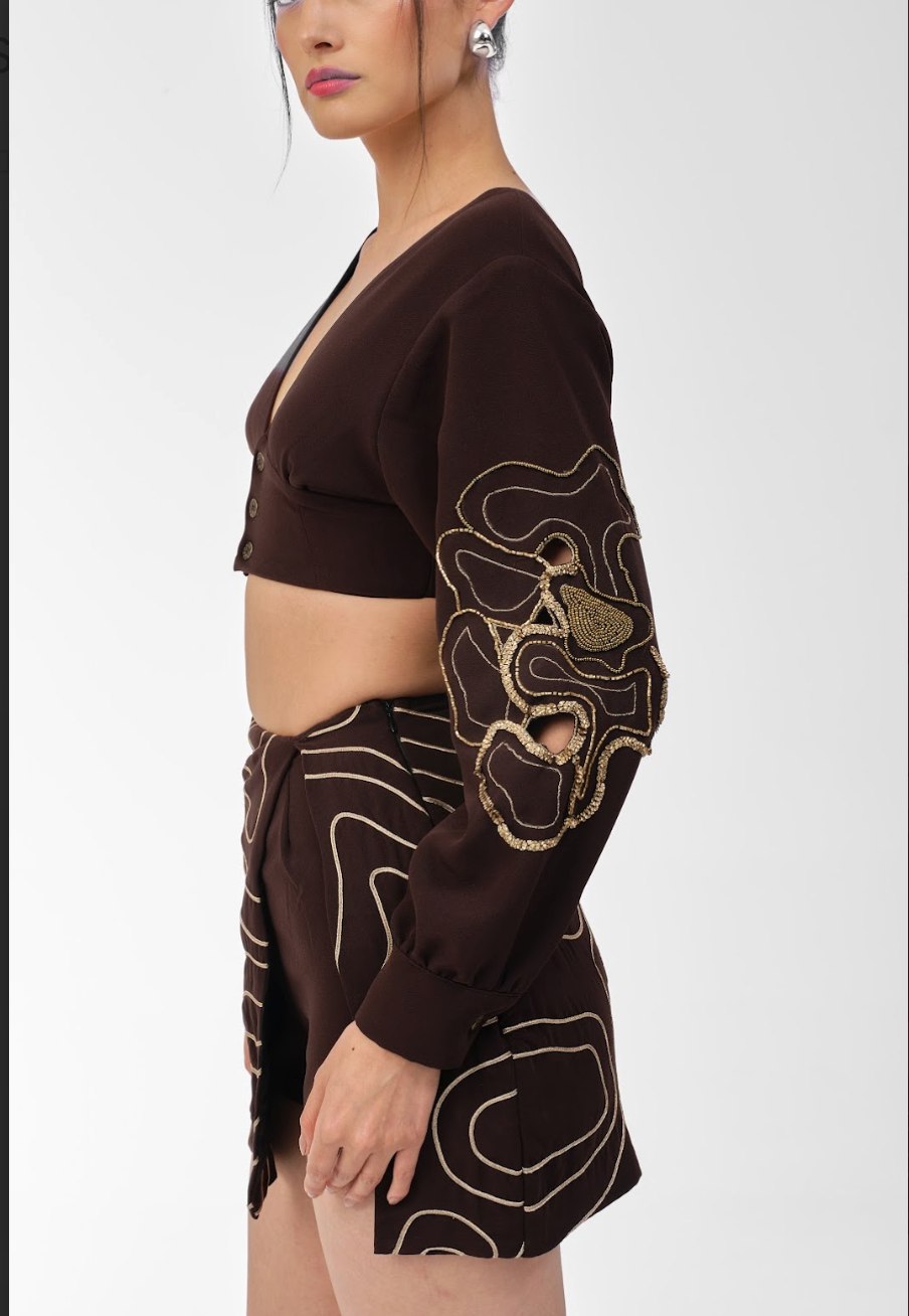 With its luxurious crepe base and delicate embroidery, the Moonseer set evokes quiet opulence. Flowing lines meet precise detailing, creating a versatile piece that whispers understated power and timeless grace.
