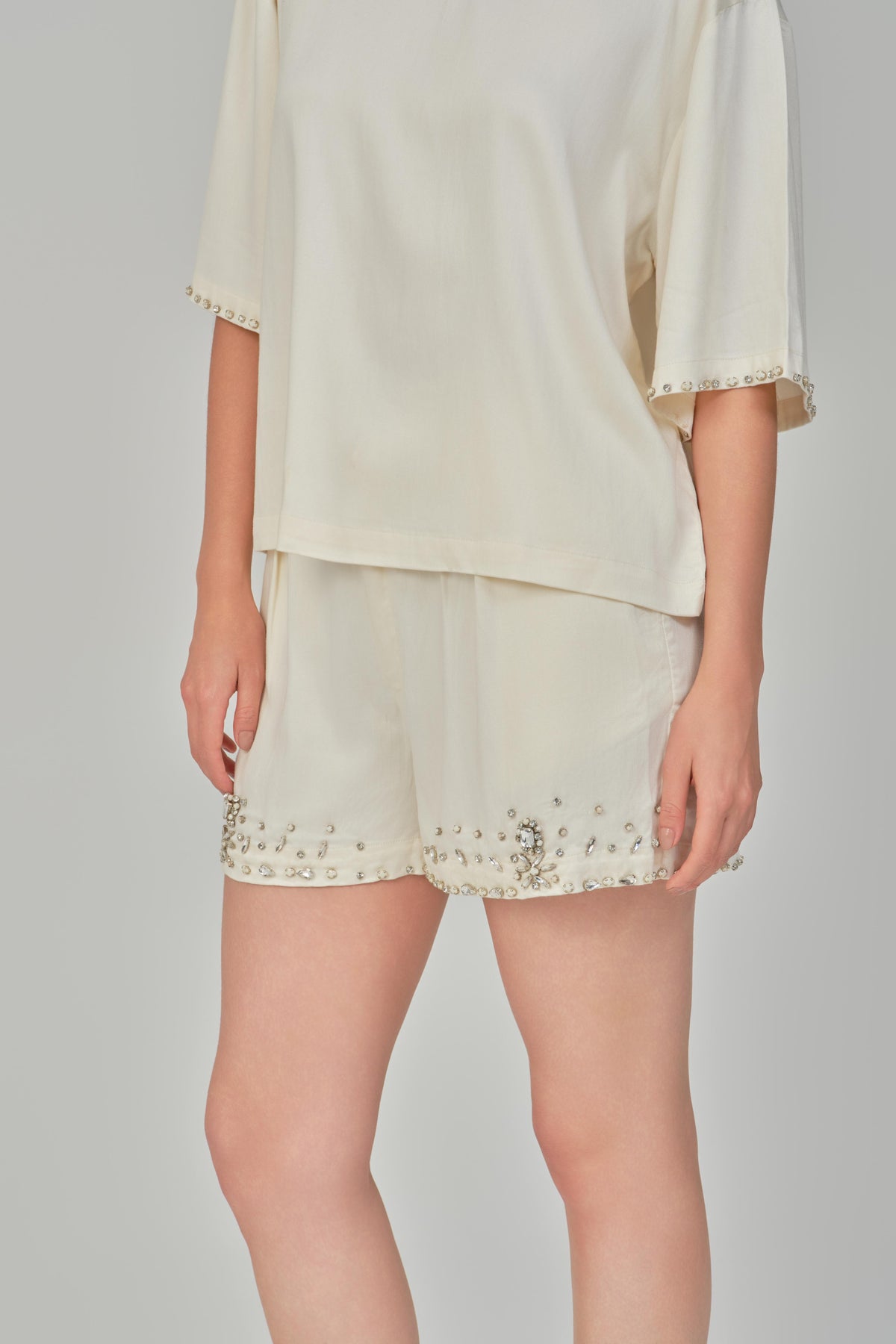 The essence of quiet luxury, Poise pairs crisp cotton twill with subtle stone embellishments. Understated yet elevated, it’s a refined staple designed for a woman who embodies confidence without excess.TECHNIQUES - STONE WORK