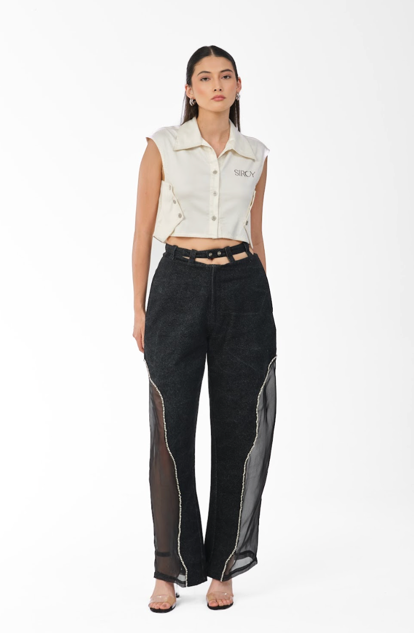 Romantic yet contemporary, Fleuriste fuses black denim with the ethereal texture of organza. Its paneled detailing and subtle stone work reflect a mood of delicate strength, like petals sculpted in stone.